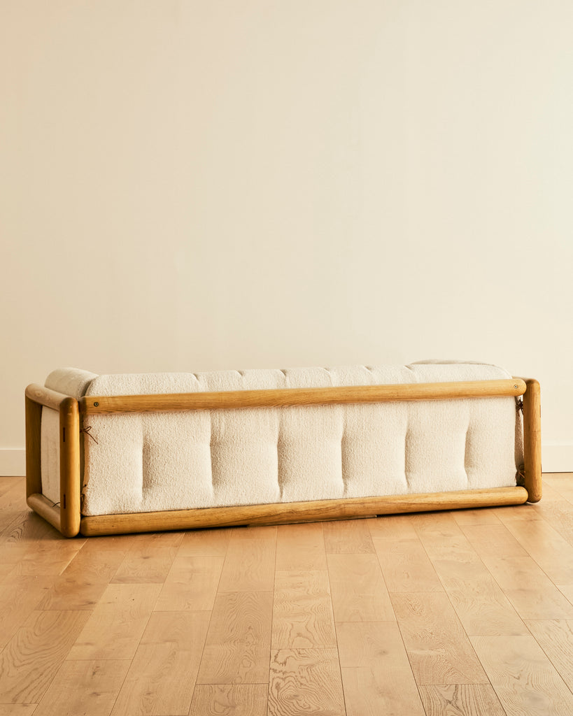 Cornaro sofa by Carlo Scarpa for Gavina upholstered in a cream boucle with tubular wooden frame and leather tie detailing on back frame.