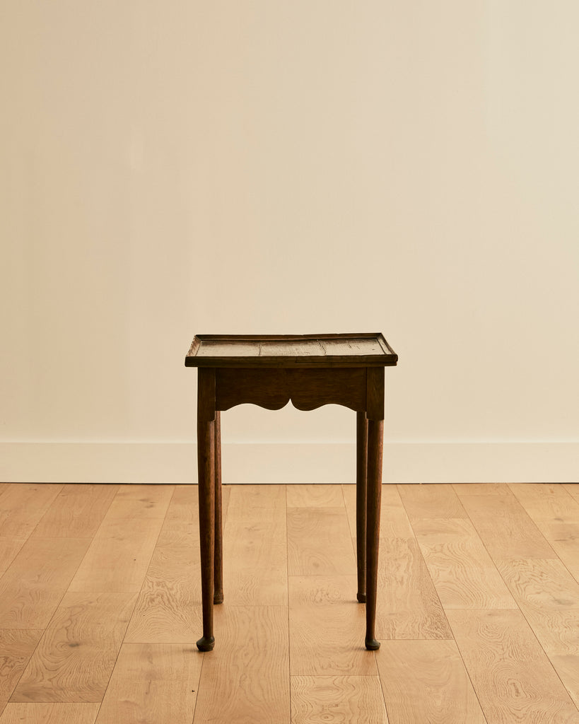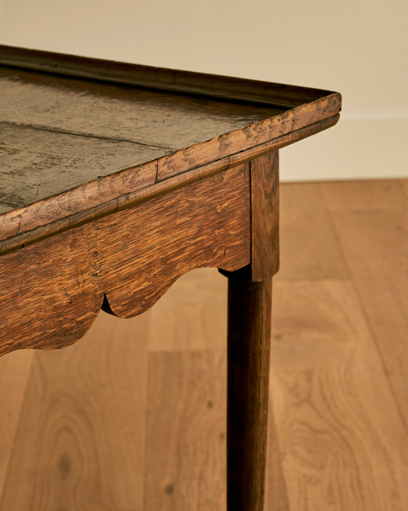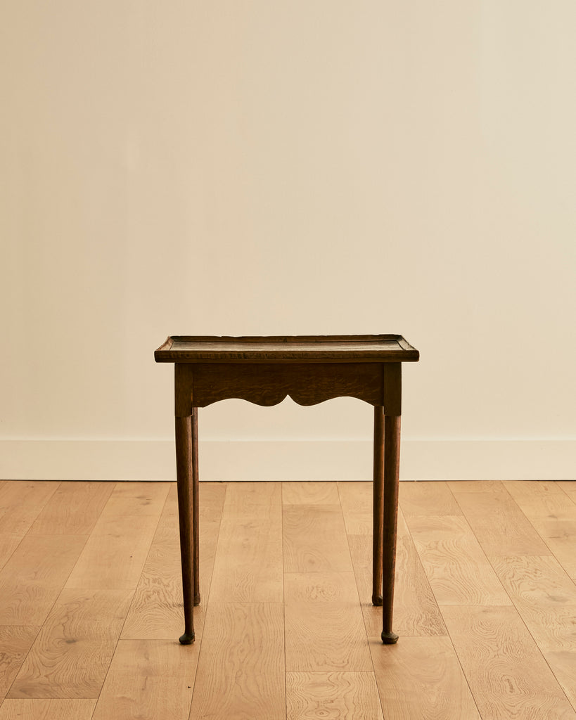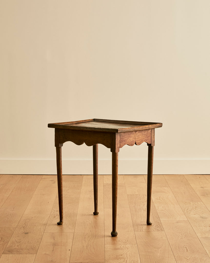 Early oak Queen Anne tea table with scalloped apron, tray top, and original pad feet.