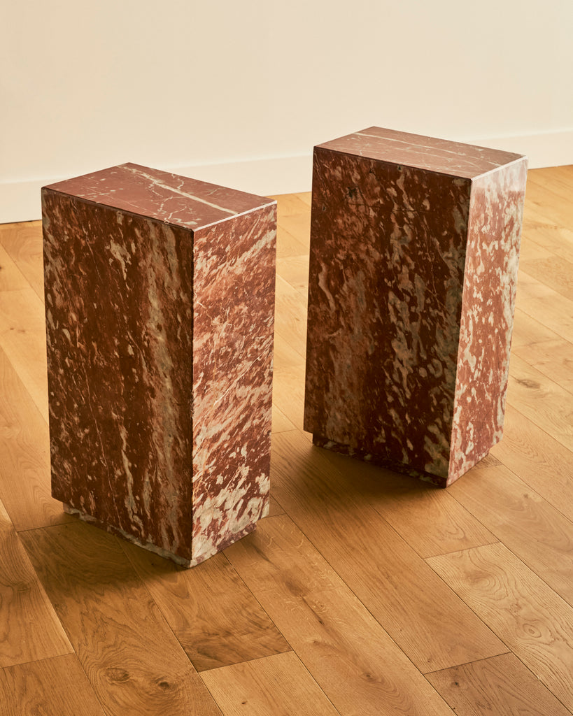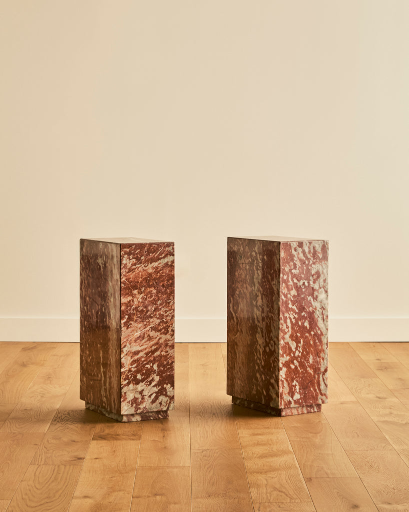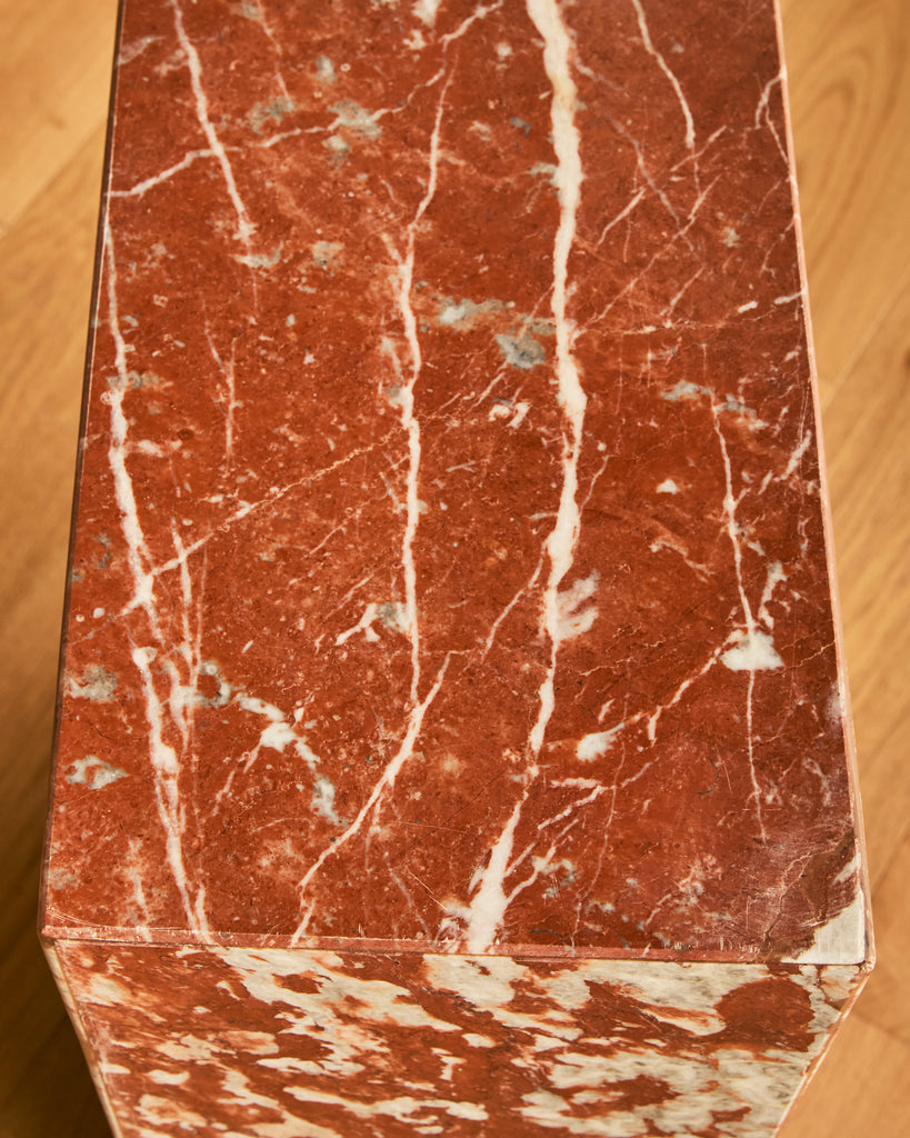 Rectangular red marble pedestal with recessed base. Two available, sold separately.