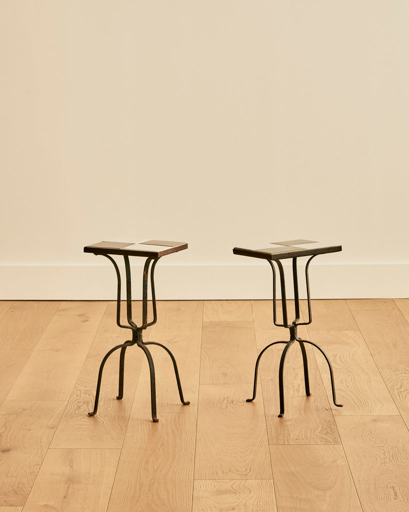 PAIR OF WROGHT IRON CHECKERED TILE SIDE TABLES
