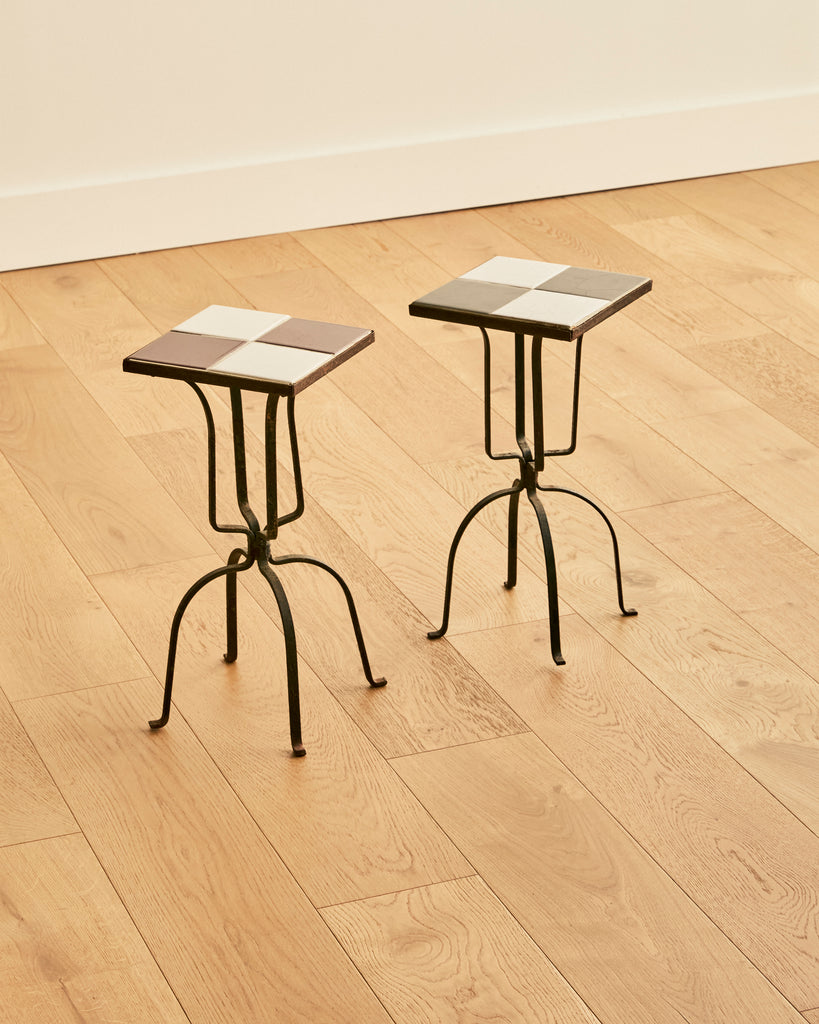 Pair of wrought iron checkered tile side tables, one in black and white, and one in burgundy and white.